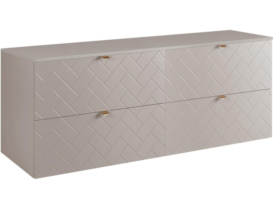 Jemné línie, nadčasová kašmírová farba a elegantné drážkovanie zásuviek (vzor „rybia kosť“) prinesú do kúpeľne dotyk luxusu. Kvalitné spracovanie z laminovanej drevotriesky (16 mm) a MDF čielka zásuviek zaručia odolnosť voči vlhkosti. Skrinku sme vybavili systémom Soft Close, ktorý zabezpečí tiché a plynulé dovieranie zásuviek. V balení nájdete tri sady úchytiek – čierne, strieborné a zlaté. Vyberte si tie, ktoré najlepšie dopĺňa Váš jedinečný štýl. Vnútorné časti zásuviek sú v svetlosivej farbe. Ku skrinke je potrebné zakúpiť plochý sifón a vrchné umývadlo.