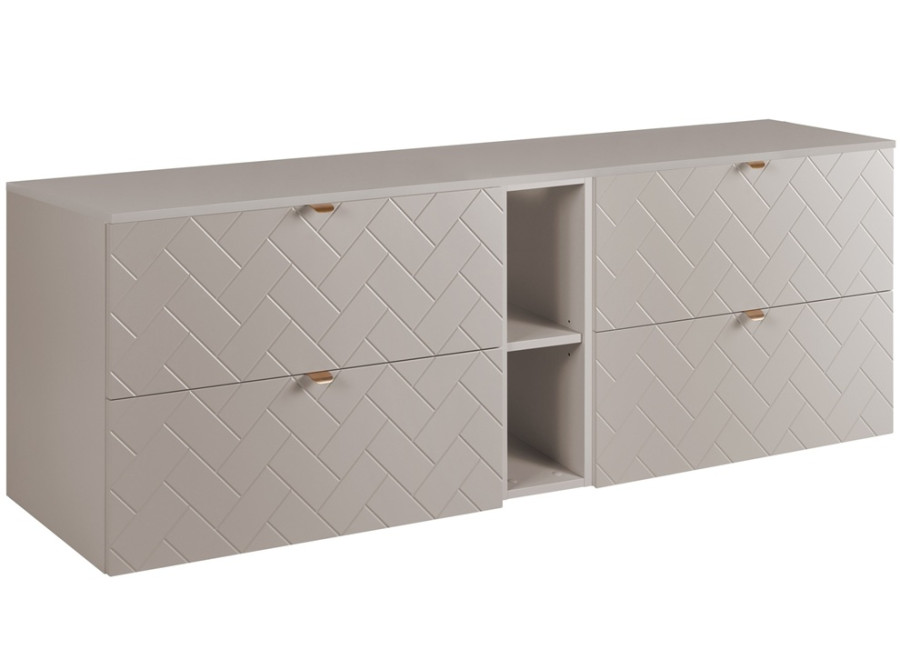 Nadčasový dizajn s moderne vzorovanými zásuvkami (vzor „rybia kosť“) a kašmírovou farbou vnesie do kúpeľne vzdušnosť a jemný nádych luxusu. Kvalitné materiály - 16 mm laminovaná drevotrieska v kombinácii s MDF čelami - zaručujú špičkový vzhľad. Inovatívny systém Soft Close sa postará o elegantné a tiché zatváranie zásuviek. Súčasťou balenia sú tri sady úchytiek - môžete si zvoliť medzi čiernymi, striebornými alebo zlatými variantmi. Vnútro zásuviek je v svetlosivej farbe. Ku skrinke je potrebné zakúpiť plochý sifón a vrchné umývadlo.