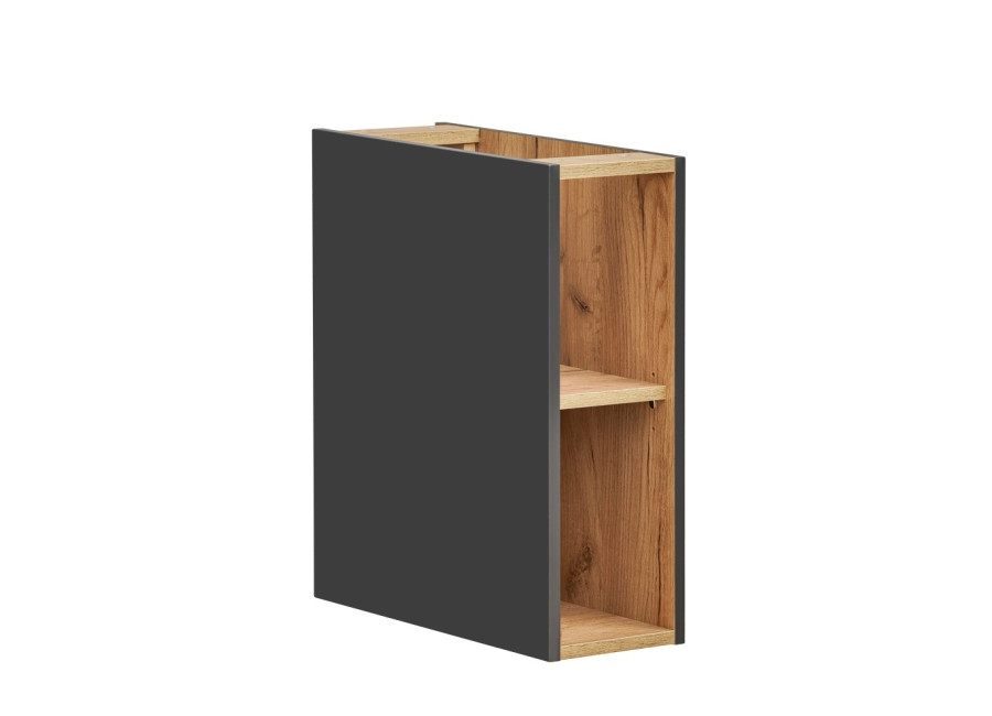 Regál COIN 810 je závesná skrinka do kúpelne vo farbe čierna matná a dub craft. Skrinka neobsahuje vrchnú dosku a je určená ako spojovacia a rozširovacia skrinka k umývadlovým skrinkám, čím ponúka flexibilitu a možnosť prispôsobiť si interiér podľa vlastných potrieb a vkusu.