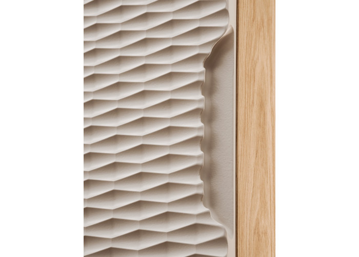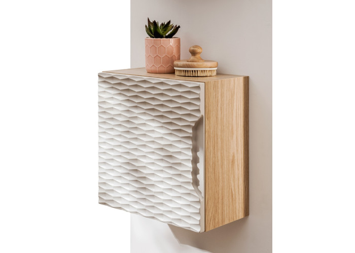 Skrinka v rozmere 35x35 cm má závesné prevedenie, čo zabezpečí elegantný vzhľad kúpeľňového priestoru s voľnou podlahovou plochou. Charakteristickým znakom tejto kolekcie sú trojrozmerné horizontálne línie na dvierkach, ktoré pripomínajú pohyb oceánskej hladiny a pridávajú nábytku jedinečný estetický rozmer. Integrovaná úchytka, zakomponovaná priamo do dizajnu dvierok, dodáva skrinke minimalistický a čistý vzhľad.