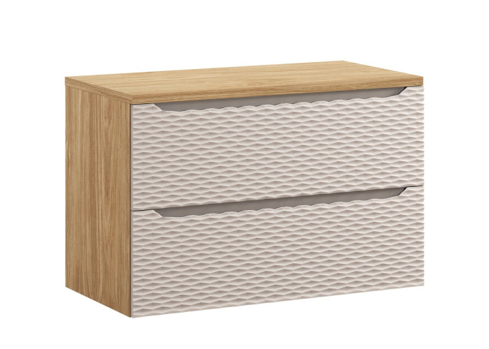 Skrinka pod umývadlo s vrchnou doskou OCEAN Beige 82-90-2S-D je elegantným a funkčným doplnkom pre každý moderný kúpeľňový interiér. Tento kvalitný kúpeľňový nábytok spája praktickosť s estetickou hodnotou, čím poskytuje štýlové riešenie pre usporiadanie a úložný priestor vo Vašej kúpeľni. Kúpeľňová skrinka pod umývadlo v šírke 90 cm je vyrobená z laminovanej drevotriesky, pričom jej odolnosť zvyšujú ABS hrany. Čielka zásuviek sú zhotovené z MDF materiálu a majú trojrozmerné horizontálne línie, ktoré evokujú pohyb oceánskej hladiny, čím prinášajú do priestoru jemný nádych prírody.