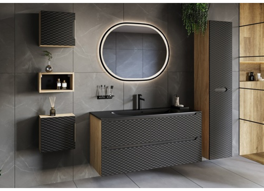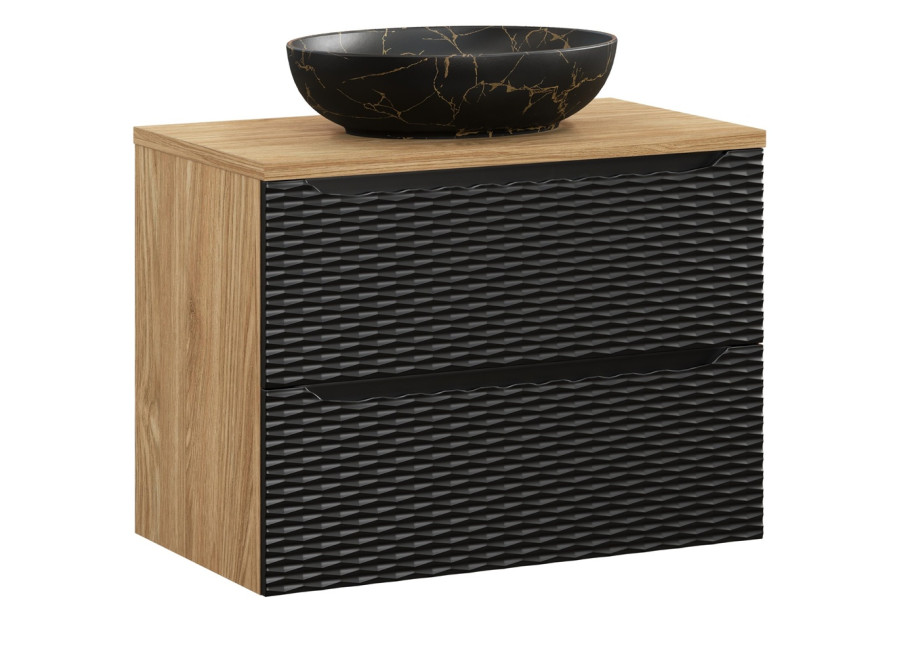 Skrinka je dostupná vo farebnom prevedení čierna matná a dub olejovaný, umožňuje Vám zladiť ju s rôznymi štýlmi interiéru. Je určená na zavesenie na stenu, čo uľahčuje údržbu podlahy a vytvára dojem vzdušnosti priestoru. Skrinka do kúpeľne je vybavená dvoma zásuvkami s funkciou tichého zatvárania, ktoré poskytujú dostatok priestoru pre všetky kúpeľňové potreby.