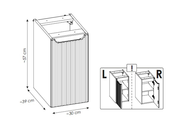 Skrinka je vyrobená z kvalitnej laminovanej drevotriesky, pričom jej hrany sú chránené odolnými ABS hranami, ktoré zvyšujú jej životnosť a odolnosť voči vlhkosti. Dvierka sú zhotovené z MDF materiálu a zdobené jemnými zvislými pásikmi, čo produktu dodáva moderný a elegantný vzhľad. Integrovaná úchytka podčiarkuje minimalistický dizajn a zároveň zaisťuje pohodlné otváranie. Praktickou vlastnosťou je tiché dovieranie dvierok, ktoré prispieva k komfortu pri každodennom používaní.