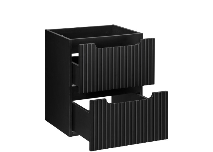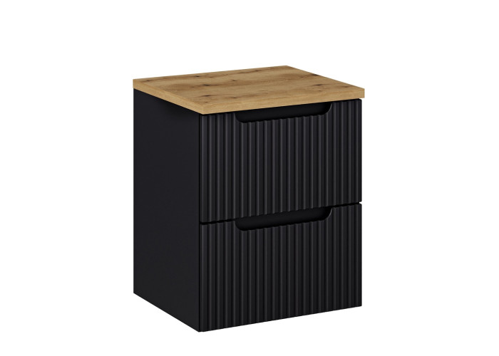 Skrinka pod umývadlo v vrchnou doskou NOVA Black 82-50-2S-DD v šírke 50 cm pochádza z kolekcie NOVA, ktorá obsahuje kvalitné skrinky do kúpeľne, vrátane vysokých a závesných skriniek. Kúpeľňová skrinka je vyrobená z kvalitnej laminovanej drevotriesky s ABS hranami, pričom čielka zásuviek sú z odolného MDF materiálu, vďaka čomu sú kúpeľňové skrinky odolné voči vlhkosti. Predné plochy sú moderne zdobené zvislými pásikmi a skrinka má integrované úchytky.