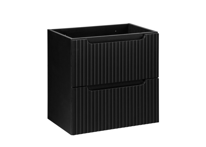Je vyrobená z kvalitnej laminovanej drevotriesky s ABS hranami. Čielka zásuviek sú z MDF materiálu a vyznačujú sa moderne zdobenými prednými plochami so zvislými pásikmi. Praktické integrované úchytky zachovávajú čistý vzhľad a farebné prevedenie čierna matná sa hodí do rôznorodých interiérov. Skrinka je určená na zavesenie na stenu, čo zjednoduší upratovanie podlahy v kúpeľni a vytvorí dojem väčšieho priestoru. Zásuvky a dvierka sú vybavené funkciou tichého dovierania, ktorá zlepšuje komfort pri každodennom používaní. K tejto skrinke pod umývadlo odporúčame zakúpiť plochý sifón, aby ste mohli zásuvku a policu využiť na maximum.