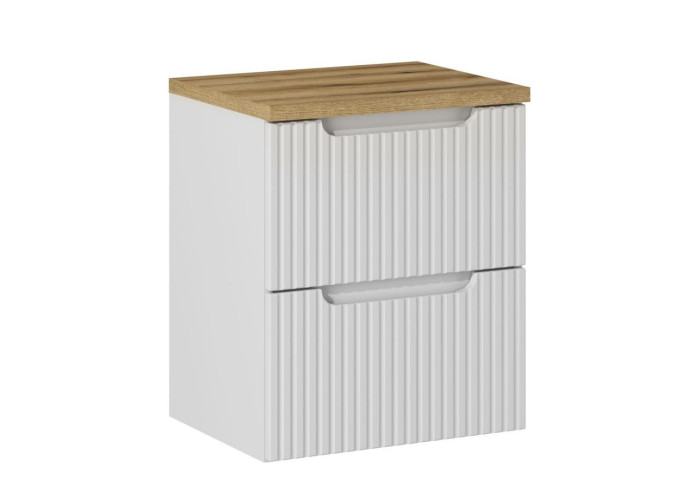 Skrinka pod umývadlo s vrchnou doskou NOVA WHITE 82-50-2S-DD je praktickým a elegantným riešením pre váš kúpeľňový priestor. Ide o zásuvkovú skrinku pod umývadlo v šírke 50 cm, vyrobenú z laminovanej drevotriesky s ABS hranami, pričom čielka zásuviek sú zhotovené z MDF materiálu. Predné plochy skrinky sú zdobené zvislými pásikmi, ktoré dodávajú skrinke jedinečný vzhľad. Integrované úchytky prispievajú k čistým líniám.