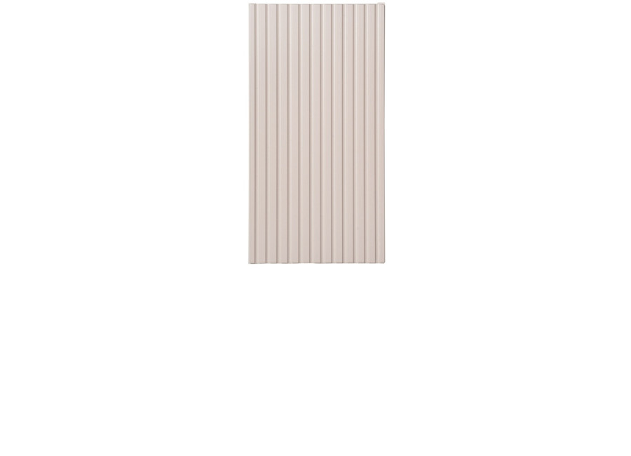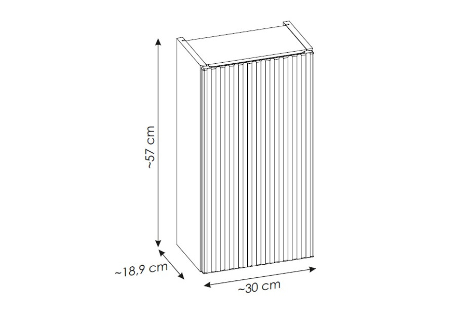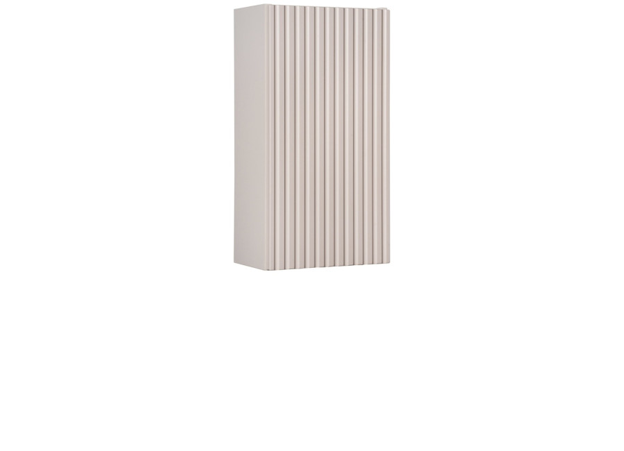 Dvierka sú zdobené zvislými pásikmi, ktoré dodávajú skrinke jedinečný vzhľad. Bezúchytkové otváranie dopĺňa minimalistický dizajn produktu. Skrinka je určená na zavesenie na stenu, čím šetrí priestor na podlahe. Systém tichého dovierania dvierok zvyšuje komfort používania.