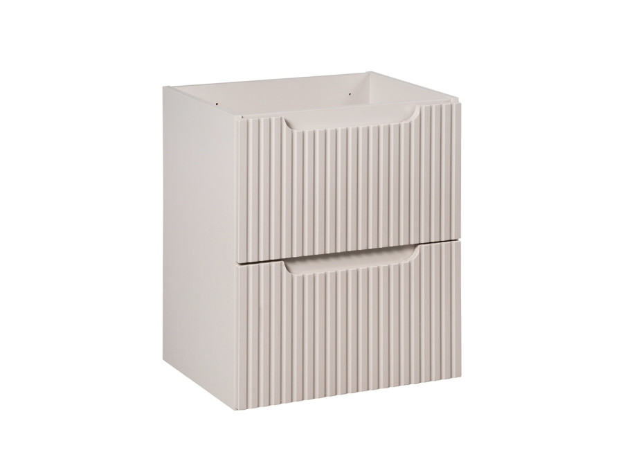 Zásuvková kúpeľňová skrinka ponúka dostatok úložného priestoru v dvoch priestranných zásuvkách. Ide o skrinku pod umývadlo v šírke 50 cm, ktorá je vhodná aj do menších kúpeľní. Korpus skrinky je vyrobený z laminovanej drevotriesky s ABS hranami. Čielka zásuviek sú zhotovené z MDF materiálu a zdôrazňujú moderný dizajn – ich predné plochy sú zdobené zvislým frézovaním (pásikmi).