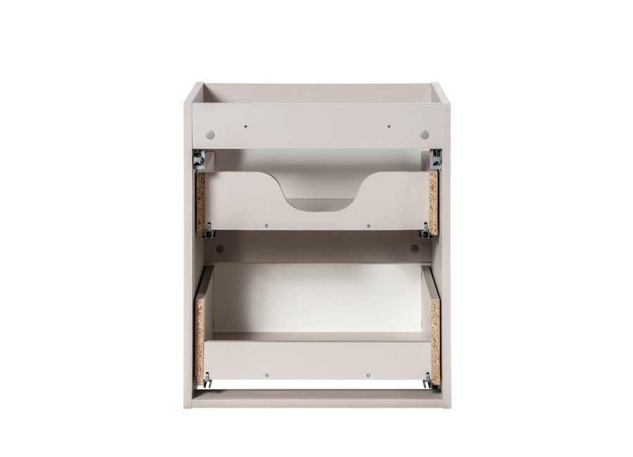 Minimalistický vzhľad podporujú integrované úchytky, ktoré sú zapustené do hrany čielok a nenarúšajú čisté línie nábytku. Celkové farebné prevedenie je kašmír (béžová) s bielou vrchnou doskou. Skrinka je určená na zavesenie na stenu, čo uľahčuje upratovanie podlahy pod ňou a dodáva kúpeľni vzdušnejší dojem. Obe zásuvky sú vybavené funkciou tichého dovierania (soft-close), ktorá zaručuje komfortné a nehlučné používanie.