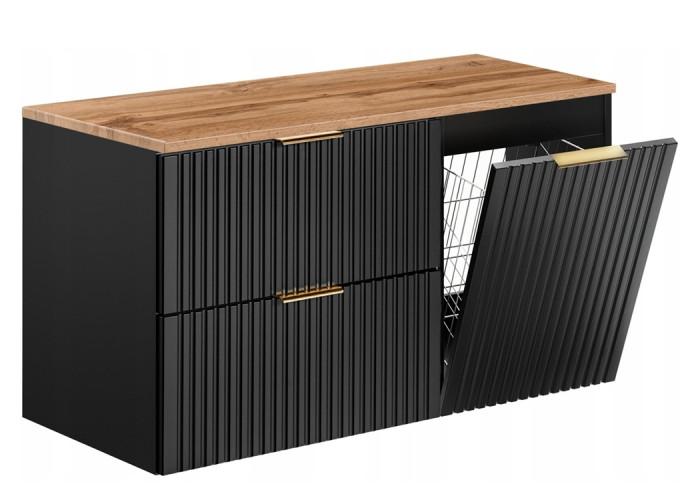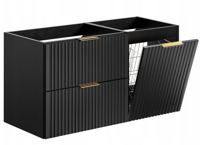 Súčasťou skrinky sú dve priestranné zásuvky a dvierka, ktoré sú vybavené systémom tichého dovierania. Veľkou výhodou je možnosť výberu z troch farebných sád úchytiek – čierna matná, lesklá zlatá a lesklá chrómová. Úchytky si tak môžete zladiť s kúpeľňovými batériami alebo ostatnými doplnkami. Skrinka pod umývadlo s košom na prádlo ponúka komfortné uloženie špinavého prádla, zásuvky využijete na hygienické potreby, čistiace prostriedky aj kozmetiku. Ku skrinke odporúčame objednať plochý sifón, ktorý umožní komfortné využitie hornej zásuvky v plnom rozsahu.