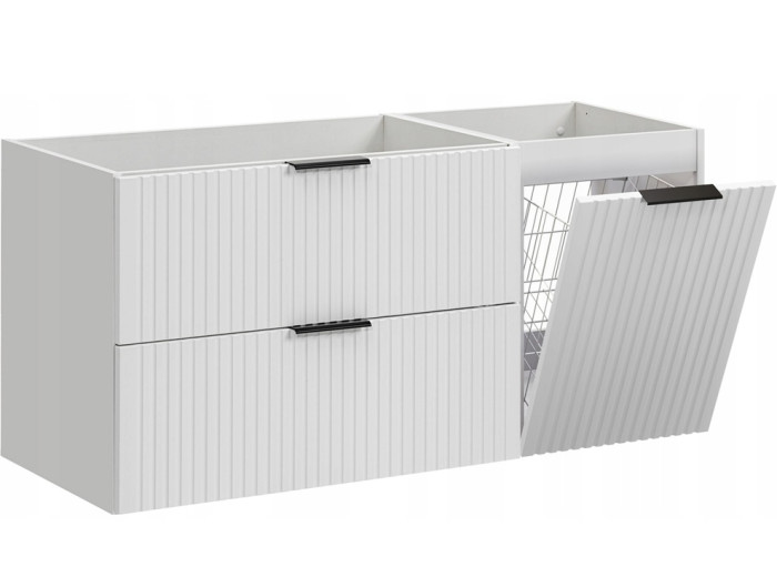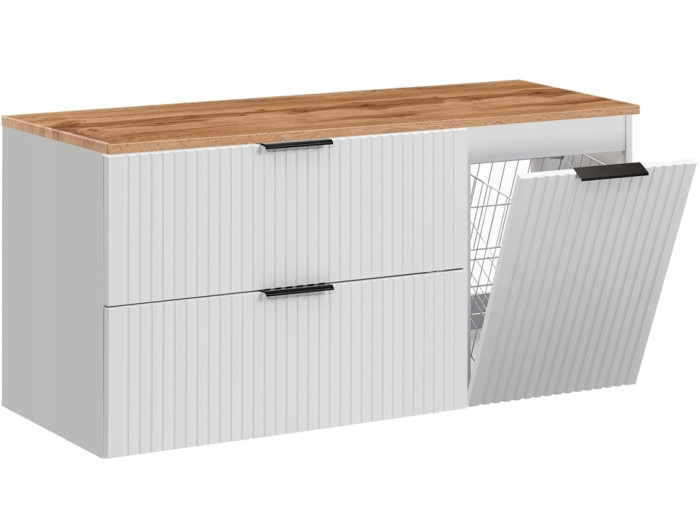 Čielka zásuviek majú zvislé ozdobné drážkovanie, ktoré dodáva celku výnimočný detail. Tri farebné sady úchytiek: čierna matná, lesklá zlatá a lesklá chrómová, umožňujú zladiť riešenie so zvyškom kúpeľňových doplnkov alebo batériou. Skrinka je určená na zavesenie na stenu, zásuvky sú vybavené funkciou tichého dovierania pre maximálny komfort pri každodennom používaní.