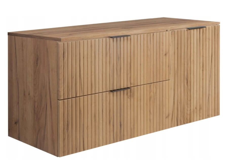 Skrinka pod umývadlo FLOW dub craft zlatý C120-80-40-DC je skrinka pod umývadlo v šírke 120 cm, patrí do kategórie kúpeľňový nábytok. Skrinka je závesná na stenu, takže uľahčuje upratovanie a opticky odľahčí priestor. Farebné prevedenie dub craft zlatý pôsobí teplo a nadčasovo. Konštrukcia je vyrobená z laminovanej drevotriesky s ABS hranami, predné plochy z MDF materiálu zdobené zvislým drážkovaním.