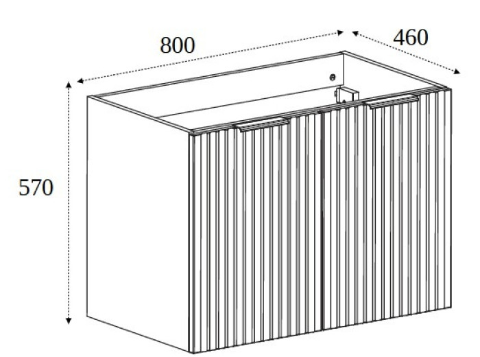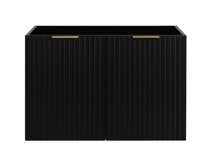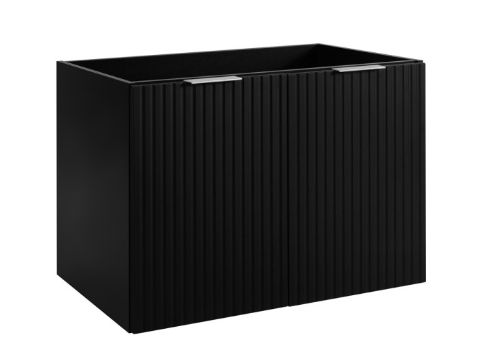 Skrinka pod umývadlo FLOW v čiernom matnom prevedení a šírke 80 cm je kvalitný kúpeľňový nábytok, ktorý predstavuje praktické riešenie pre moderné kúpeľne. Vyrobená je z laminovanej drevotriesky s ABS hranami, čím zaisťuje zvýšenú odolnosť voči vlhkosti a predné plochy z MDF materiálu sú dekorované zvislým drážkovaním. Závesná konštrukcia umožňuje efektívne využitie priestoru pod umývadlom a jednoduché čistenie podlahy.