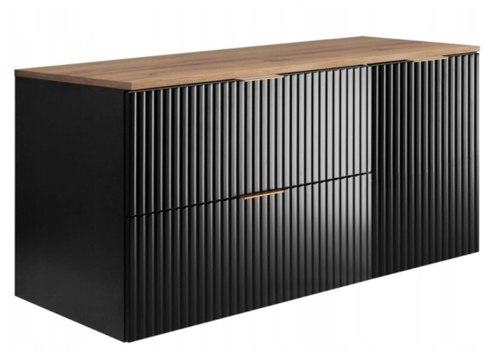 Kúpeľňová skrinka je vyrobená z laminovanej drevotriesky s ABS hranami, ktoré zabezpečujú odolnosť voči vlhkosti typickej pre kúpeľňové prostredie. Predné plochy sú z MDF materiálu a zdobené zvislým drážkovaním, ktoré dodáva decentný vzhľad. Závesná konštrukcia umožňuje jednoduché čistenie priestoru pod skrinkou a zároveň šetrí miesto v kúpeľni.