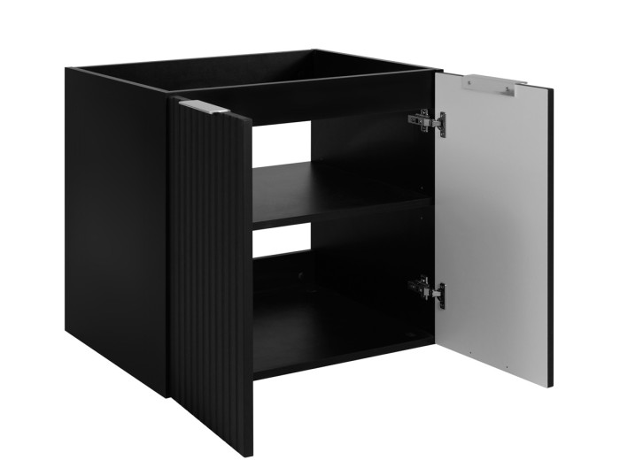 Skrinka pod umývadlo FLOW v čiernom matnom prevedení a šírke 140 cm predstavuje kvalitný kúpeľňový nábytok, ktorý je navrhnutý so zreteľom na funkčnosť a estetiku. Skladá sa z troch častí: