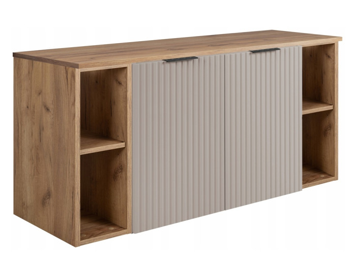 Kúpeľňová skrinka je vyrobená z laminovanej drevotriesky s ABS hranami, čelné plochy dvierok sú zhotovené z MDF materiálu. Kašmírové farebné prevedenie nádherne doplní béžové kúpeľňové priestory a dodá im nádych luxusu. Moderné drážkované čelá dvierok pridávajú skrinke osobitý charakter a originálny vzhľad. Skrinka je navrhnutá na upevnenie na stenu, čo nielen uvoľní podlahový priestor a vytvorí vzdušný dojem, ale tiež zjednodušuje upratovanie. V balení nájdete tri sady úchytiek – čierne, zlaté a chrómové – ktoré Vám umožnia prispôsobiť skrinku Vášmu interiéru.