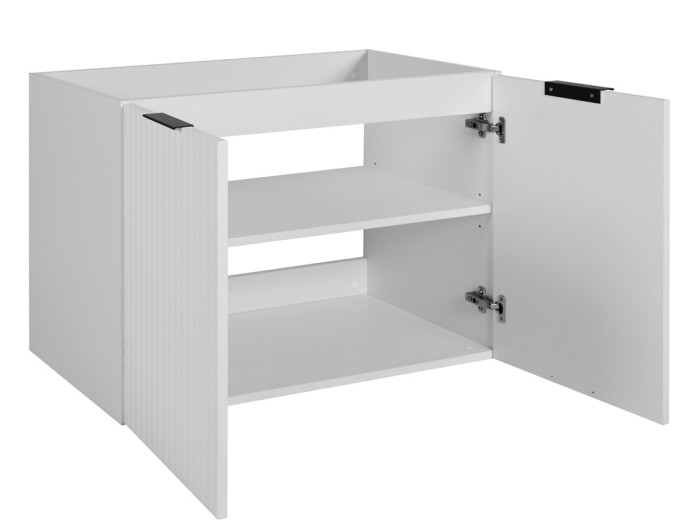 Skrinka pod umývadlo FLOW biely matný W80D2 je praktickým riešením pre moderné kúpeľne, kde sa kladie dôraz na funkčnosť a čistý dizajn. Skrinka pod umývadlo v šírke 80 cm je vyrobená z laminovanej drevotriesky s ABS hranami, čo zaručuje jej trvácnosť a odolnosť voči vlhkosti. Predné plochy z MDF materiálu sú zdobené zvislým drážkovaním, ktoré vytvára elegantný vzhľad a zároveň nadväzuje na aktuálne trendy v oblasti nábytku do kúpeľne. Farebné prevedenie biela matná pôsobí čisto a ľahko sa kombinuje s ostatnými prvkami kúpeľňového zariadenia.