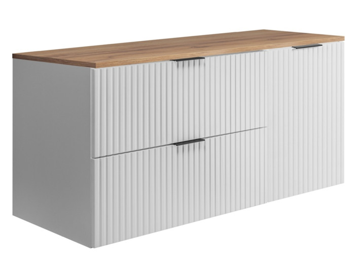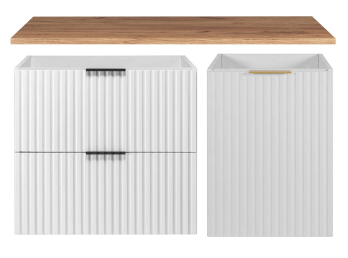 Kombinácia bielej matnej farby a dekoru dub craft zlatý pôsobí elegantne a príjemne zjemňuje priestor kúpeľne. Skrinka je závesná na stenu, čo uľahčuje udržiavanie čistoty podlahy a zároveň opticky zväčšuje priestor. Kúpeľňové skrinky z tejto kolekcie FLOW sú vyrobené z laminovanej drevotriesky s ABS hranami, pričom predné plochy z MDF materiálu sú zdobené zvislým drážkovaním. Dvierka a zásuvky sú vybavené funkciou tichého dovierania, ktorá zaručuje pohodlné a tiché používanie bez zbytočného hluku. V balení nájdete tri sady úchytiek: čiernu matnú, lesklú zlatú a lesklú chrómovú, vďaka ktorým si môžete doladiť vzhľad skrinky podľa farby batérie alebo ostatných kúpeľňových doplnkov.
