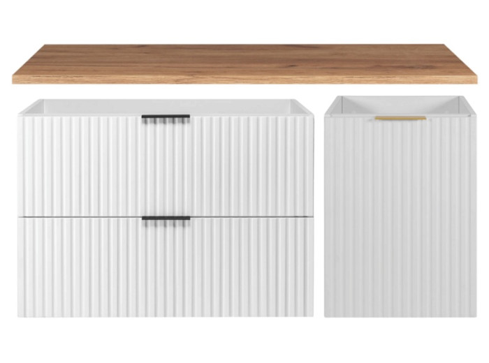 Kombinácia bielej matnej farby a dekoru dub craft zlatý pôsobí elegantne a príjemne zjemňuje priestor kúpeľne. Skrinka je závesná na stenu, čo uľahčuje udržiavanie čistoty podlahy a zároveň opticky zväčšuje priestor. Kúpeľňové skrinky z tejto kolekcie FLOW sú vyrobené z laminovanej drevotriesky s ABS hranami, pričom predné plochy z MDF materiálu sú zdobené zvislým drážkovaním. Dvierka a zásuvky sú vybavené funkciou tichého dovierania, ktorá zaručuje pohodlné a tiché používanie bez zbytočného hluku. V balení nájdete tri sady úchytiek: čiernu matnú, lesklú zlatú a lesklú chrómovú, vďaka ktorým si môžete doladiť vzhľad skrinky podľa farby batérie alebo ostatných kúpeľňových doplnkov.
