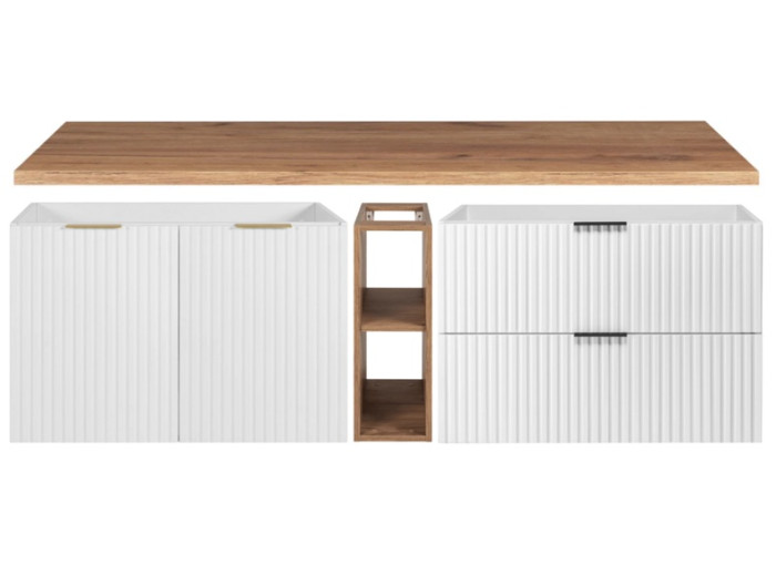 Skrinka je závesná na stenu, čo pôsobí vzdušne a uľahčuje údržbu podlahy v kúpeľni. Kúpeľňové skrinky z tejto kolekcie sú vyrobené z laminovanej drevotriesky s ABS hranami, pričom predné plochy z MDF materiálu sú zdobené zvislým drážkovaním. Vďaka kvalite spracovania a použitým materiálom ide o kvalitné skrinky odolné voči vlhkosti. Dvierka a zásuvky sú vybavené funkciou tichého dovierania, čo zvyšuje komfort pri každodennom používaní. V balení nájdete tri sady úchytiek: čiernu matnú, lesklú zlatú a lesklú chrómovú, ktoré si môžete vybrať podľa farebného ladenia vašej kúpeľne a kúpeľňových doplnkov.