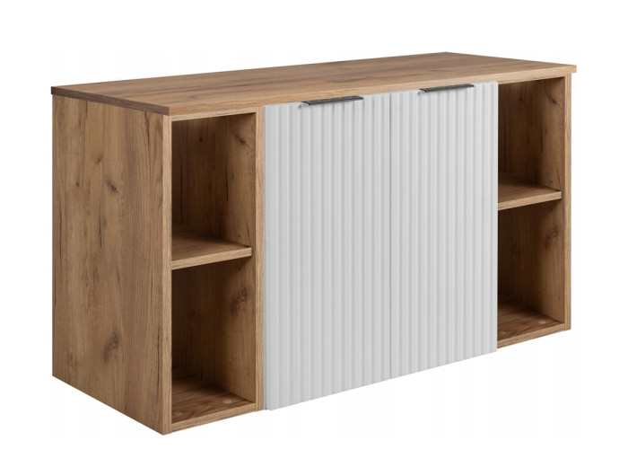 Skrinka pod umývadlo FLOW biely matný W100R60RDC-2 je biely kúpeľňový nábytok, ktorý pôsobí čisto a nadčasovo, pričom vďaka kombinácii bielej matnej farby a dubu craft zlatý vnáša do priestoru elegantný nádych. Skrinka pod umývadlo v šírke 100 cm sa skladá z troch častí: