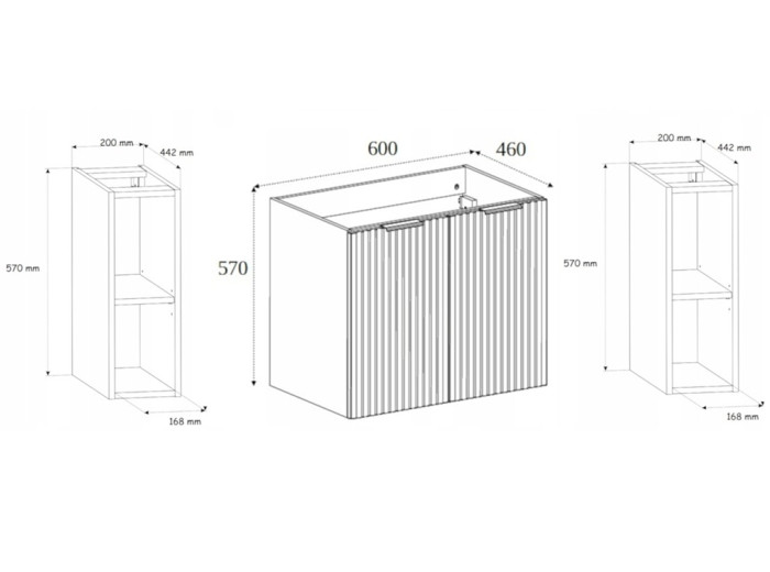 Skrinka je závesná na stenu, čím zabezpečuje jednoduchšie čistenie podlahy a opticky odľahčuje priestor kúpeľne. Kúpeľňové skrinky z kolekcie FLOW sú vyrobené z laminovanej drevotriesky s ABS hranami, čo zaručuje ich dlhú životnosť a odolnosť voči vlhkosti. Predné plochy z MDF materiálu sú zdobené jemným zvislým drážkovaním, ktoré dodáva skrinke decentný vzhľad a podčiarkuje kvalitu spracovania. Dvierka sú vybavené funkciou tichého dovierania pre pohodlné a tiché používanie. V balení sa nachádzajú tri sady úchytiek: čierna matná, lesklá zlatá a lesklá chrómová, vďaka ktorým si môžete prispôsobiť vzhľad skrinky k ostatným kúpeľňovým doplnkom alebo k farbe batérie.