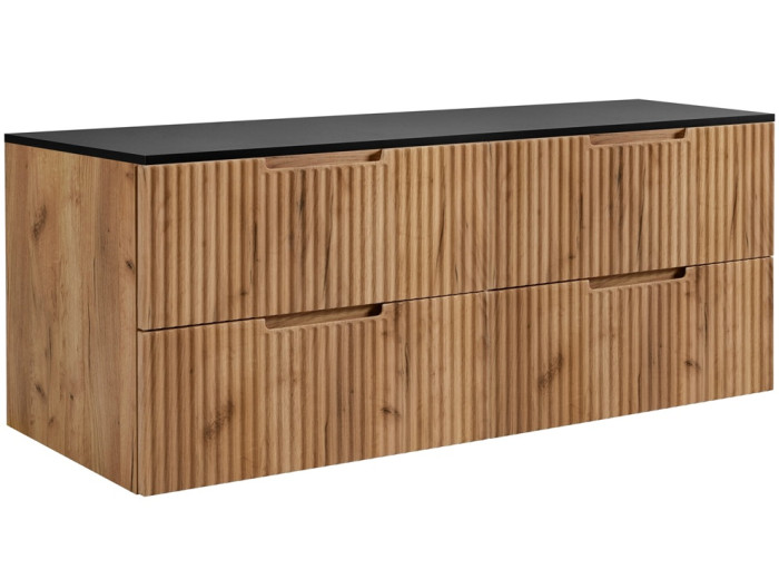 Skrinka do kúpeľne VENA C160DB ponúka riešenie pre priestranné kúpeľne. Ide o skrinku pod umývadlo v šírke 160 cm, ktorá sa skladá z dvoch 80 cm skriniek pod umývadlo a vrchnej dosky v čiernej farbe o celkovej dĺžke 160 cm. Tento kúpeľňový nábytok je vyrobený z laminovanej drevotriesky s ABS hranami, pričom predné plochy sú z MDF materiálu so zvislým drážkovaním. Farebné prevedenie dub craft zlatý vytvára teplý a prírodný vzhľad, ktorý sa hodí do viacerých interiérových štýlov. Vnútorné časti zásuviek majú svetlosivú farbu, ktorá pôsobí neutrálne a prakticky. Skrinka je závesná na stenu, čím umožňuje jednoduchú údržbu podlahy a opticky odľahčuje celý priestor.