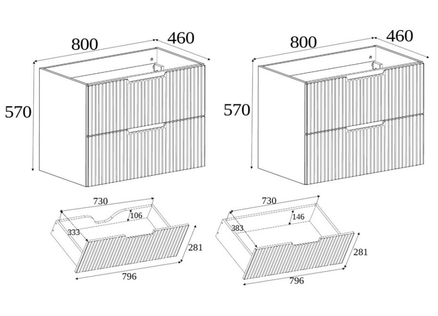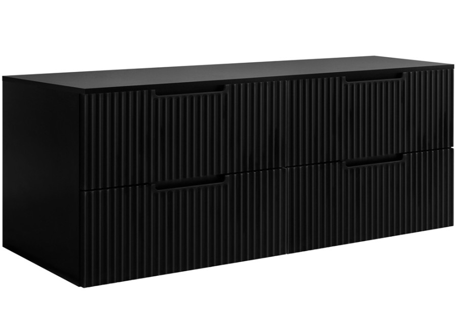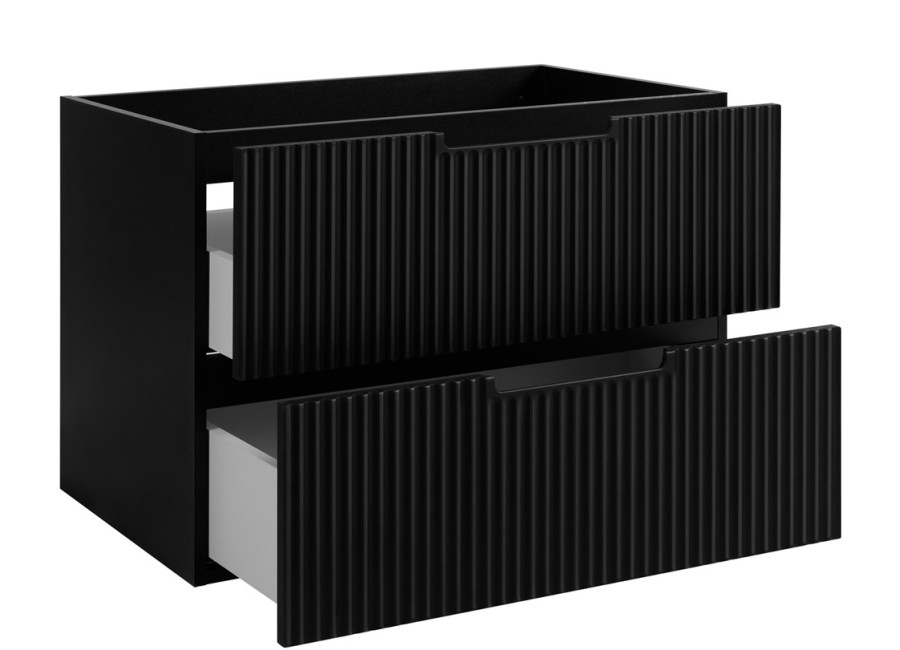 Vďaka tomu poskytuje rozsiahlu plochu pre umývadlá a odkladanie. Je vyrobená z laminovanej drevotriesky s ABS hranami, jej predné plochy sú z kvalitného MDF materiálu, zdobené zvislým drážkovaním v čiernej matnej farbe, zatiaľ čo vnútorné časti zásuviek sú v svetlosivom prevedení.
