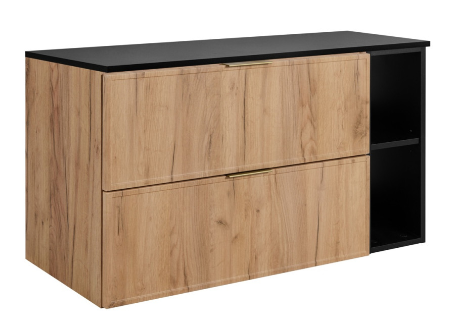 Skrinka pod umývadlo SLIM v prevedení dub craft zlatý/čierna s označením C100DB je ideálnou voľbou pre tých, ktorí hľadajú kombináciu štýlového dizajnu a praktického úložného priestoru v kúpeľni. Tento model má šírku 100 cm a skladá sa z 80 cm zásuvkovej skrinky, 20 cm čierneho regálu a 100 cm čiernej vrchnej dosky. Kúpeľňové skrinky sú vyrobené z laminovanej drevotriesky s ABS hranami, pričom predné plochy sú z MDF a zdobené jemným úzkym rámčekom, ktorý im dodáva elegantný vzhľad.
