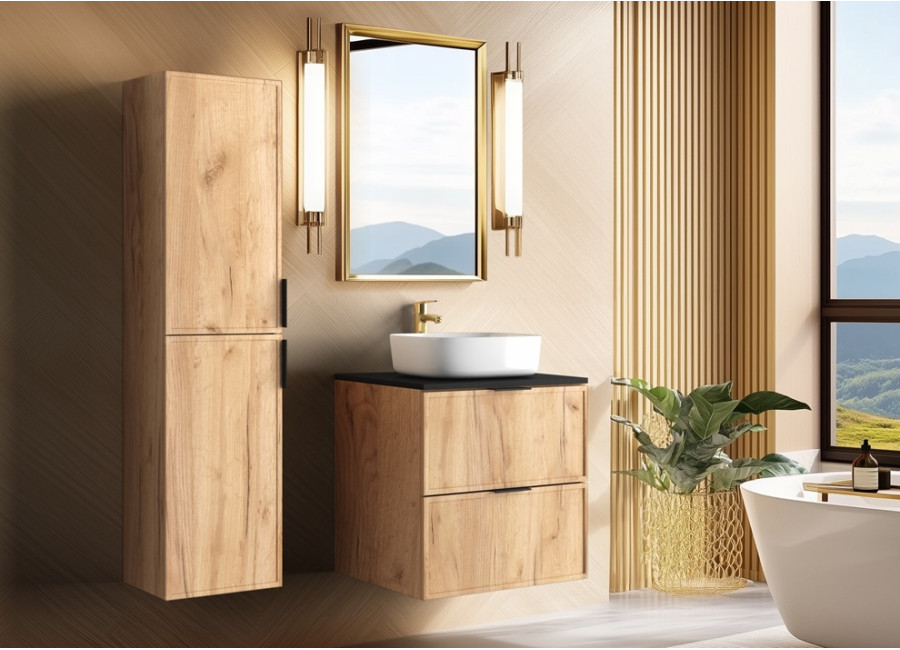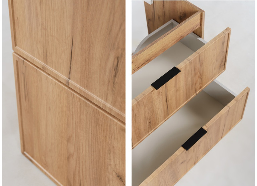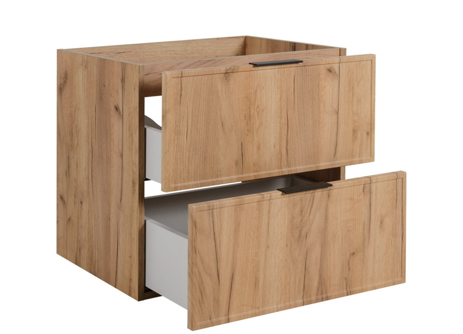 Tento nábytok do kúpeľne je vyrobený z laminovanej drevotriesky s ABS hranami, pričom predné plochy z MDF materiálu sú zdobené jemným úzkym rámčekom, čo dodáva skrinke elegantný a moderný vzhľad. Súčasťou balenia sú tri farebné sady úchytiek v čiernej, zlatej a striebornej farbe, ktoré umožňujú prispôsobiť kúpeľňové skrinky k vášmu interiéru a doladiť ich s farbou batérie alebo inými doplnkami. Skrinka je povrchovo upravená vo farebnom prevedení dub craft zlatý, zatiaľ čo vnútorné časti zásuviek sú v kontrastnej svetlosivej farbe. Je navrhnutá ako závesná na stenu, čo dodáva vašej kúpeľni moderný a vzdušný vzhľad. Zásuvky sú vybavené funkciou tichého dovierania pre maximálny komfort pri používaní.