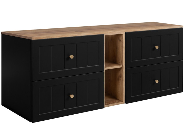 Vďaka kombinácii zásuvkovej časti, policového regálu a dlhej vrchnej dosky môžete uložiť všetko od každodenných hygienických pomôcok, cez drobné doplnky, až po balíky čistiacich prostriedkov. Výrobný materiál tvorí laminovaná drevotrieska s ABS hranami, ktoré zvyšujú odolnosť voči vlhkosti, zatiaľ čo predné plochy z MDF materiálu sú zdobené jemným drážkovaním. Skrinka je závesná na stenu a jej zásuvky sú vybavené funkciou tichého dovierania. Farebné prevedenie čierna matná/dub craft zlatý je doplnené o svetlosivé vnútorné časti zásuviek. Súčasťou balenia sú tri farebné sady úchytiek: čierna, zlatá a strieborná, ktoré môžete ľahko zladiť s farbou batérie alebo inými doplnkami v kúpeľni. Pre maximálne využitie hornej zásuvky odporúčame zakúpiť plochý sifón.