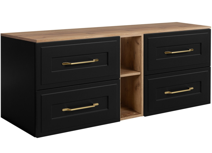 Je vyrobená z laminovanej drevotriesky s ABS hranami, predné plochy z MDF materiálu zdobené frézovaním v tvare rámčeka. Farebné prevedenie je čierna matná/dub craft zlatý, vnútorné časti zásuviek sú v svetlosivej farbe. Skrinka je závesná na stenu, vďaka čomu zostáva podlaha voľná a údržba je výrazne jednoduchšia.