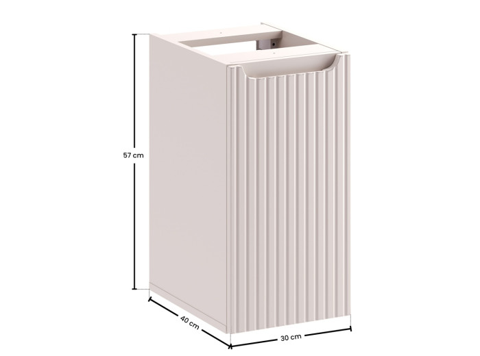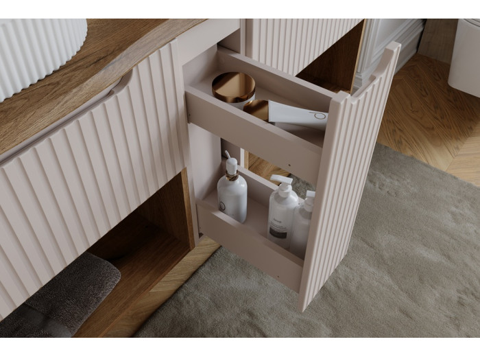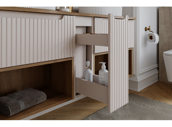 Skrinka s výsuvom NOVA Cashmere 81-30-39-C patrí medzi kúpeľňové skrinky v modernom dizajne. Skrinka do kúpeľne v šírke 30 cm je určená na uloženie malých drobností a môžete ňou rozšíriť napr. skrinky pod umývadlo. Vyrobená je z laminovanej drevotriesky s ABS hranami, predné plochy sú z MDF materiálu. Farebné prevedenie je kašmír, jemný odtieň, ktorý príjemne zjemní celkový vzhľad vašej kúpeľne a ladí prakticky s akoukoľvek kombináciou farieb.