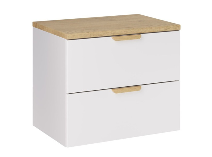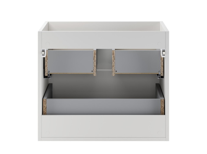 Kúpeľňová skrinka je závesná na stenu, čo uľahčuje upratovanie podlahy a zároveň vytvára vzdušnejší dojem v kúpeľni. Vyrobená je z laminovanej drevotriesky s ABS hranami. Zásuvky vybavené funkciou tichého dovierania zvyšujú komfort používania a prispievajú k plynulému a tichému chodu pri každodennom používaní. Vnútorný priestor skrinky je vhodný na uloženie hygienických potrieb, kozmetiky, čistiacich prostriedkov či menších uterákov.
