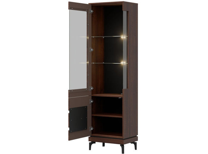 Vitrína je vyrobená z laminovanej drevotriesky v hrúbke 16 mm s ABS hranami, predné plochy sú z MDF materiálu. Dvierka sa otvárajú systémom Push to Open, vďaka čomu zostáva čelná plocha čistá a nerušená úchytkami. Farebné prevedenie je orech opera, ktoré pôsobí prirodzene a ľahko sa kombinuje s ostatným nábytkom v obývačke. Vnútorný priestor je vhodný na uloženie dekorácií, kníh, dokumentov alebo menších bytových doplnkov, pričom presklená horná časť umožňuje vystaviť vybrané predmety. Celkový vzhľad dopĺňajú 12 cm vysoké nožičky, ktoré vitríne dodávajú ľahkosť a uľahčujú údržbu podlahy pod nábytkom.