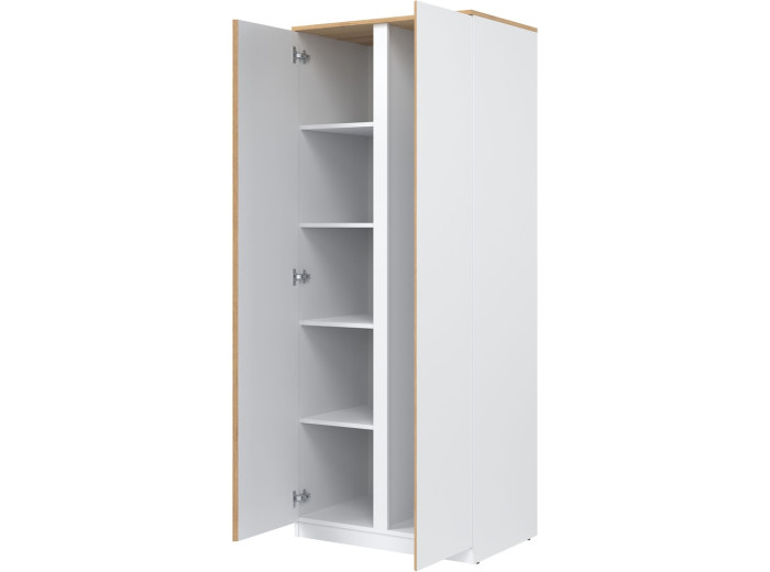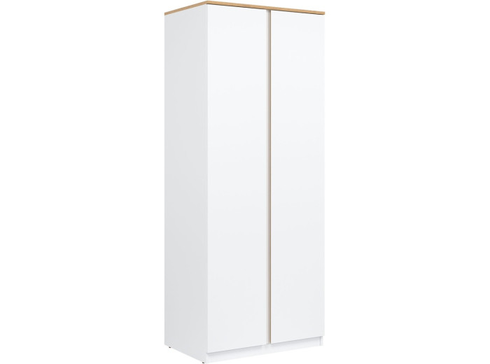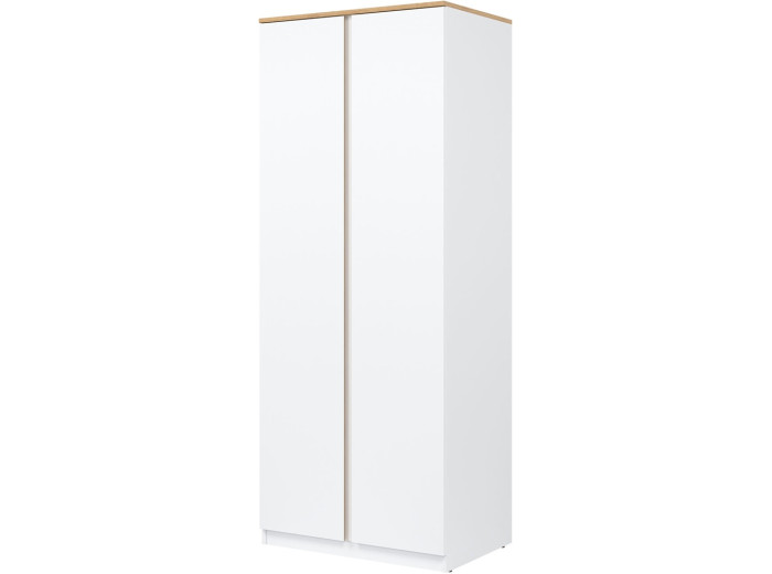 Šatníkovo-policová skriňa REMI RM10 v šírke 78 cm je vhodná aj do menších miestností alebo ako doplnok k väčšej zostave. Vyrobená je z laminovanej drevotriesky v hrúbke 16 mm s ABS hranami. Farebné prevedenie je biela + dub evoke. Má dvoje dvierka, pričom tradičné úchytky boli nahradené frézovanými hranami vo farbe dub. Vnútorné usporiadanie umožňuje zavesiť oblečenie na vešiakovú tyč, druhá polovica skrine je policová. Skriňa sa osvedčí nielen v obývačke, ale aj v detských izbách, kde poskytne praktický priestor na oblečenie, školské potreby či hračky.