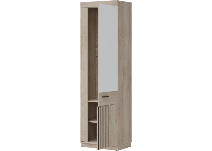 Skriňa do predsiene MATI MI14 so šírkou 58,5 cm je ideálnym riešením do moderných interiérov, kde záleží na štýle aj praktickosti. Zhotovená je z kvalitnej laminovanej drevotriesky v dekore dub cremona cotta s hrúbkou 16 mm a ABS hranami. Elegantný vzhľad podčiarkuje zrkadlo a zvislé lamely na čiernom podklade, ktoré dodávajú nábytku jedinečný charakter. Skriňu je možné zmontovať v ľavom aj pravom prevedení podľa dispozície priestoru. Dvierka sú vybavené systémom tichého dovierania.