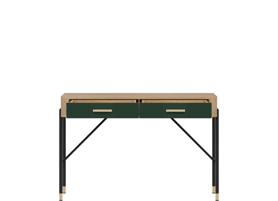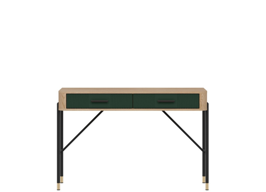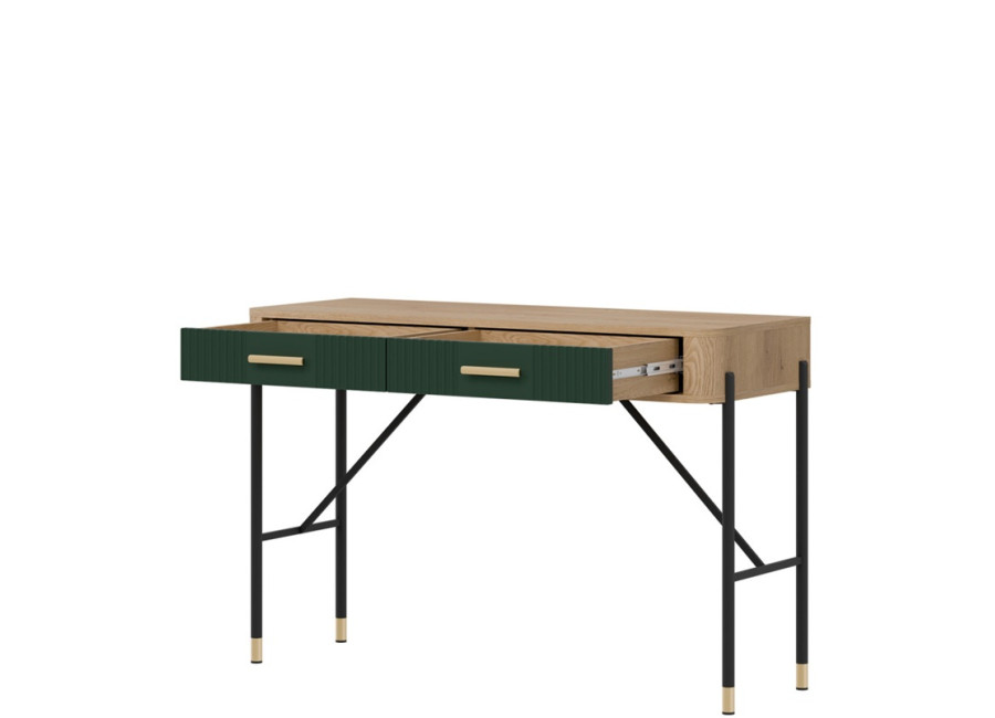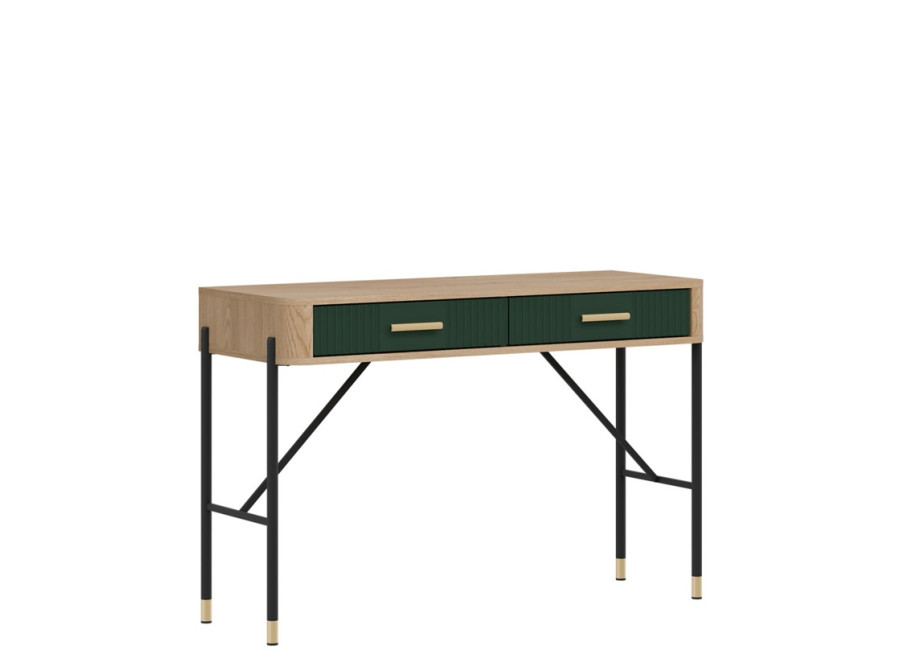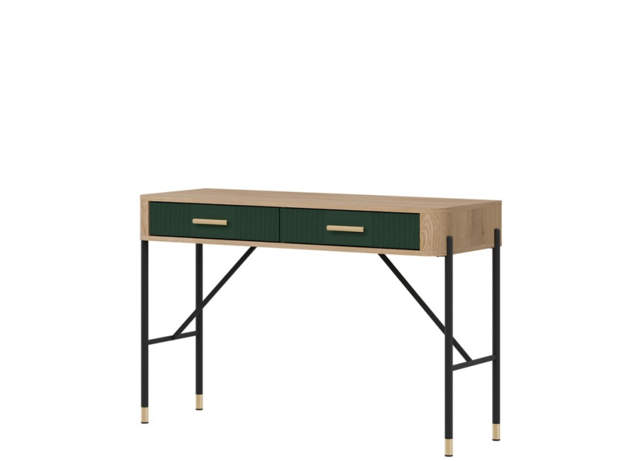 Toaletný stolík DANTE vyniká moderným dizajnom a detailami. Dve zásuvky s kovovými úchytkami (v čiernom alebo zlatom prevedení) poskytujú dostatok úložného priestoru pre kozmetiku či drobnosti dennej potreby, ktoré chcete mať vždy poruke.