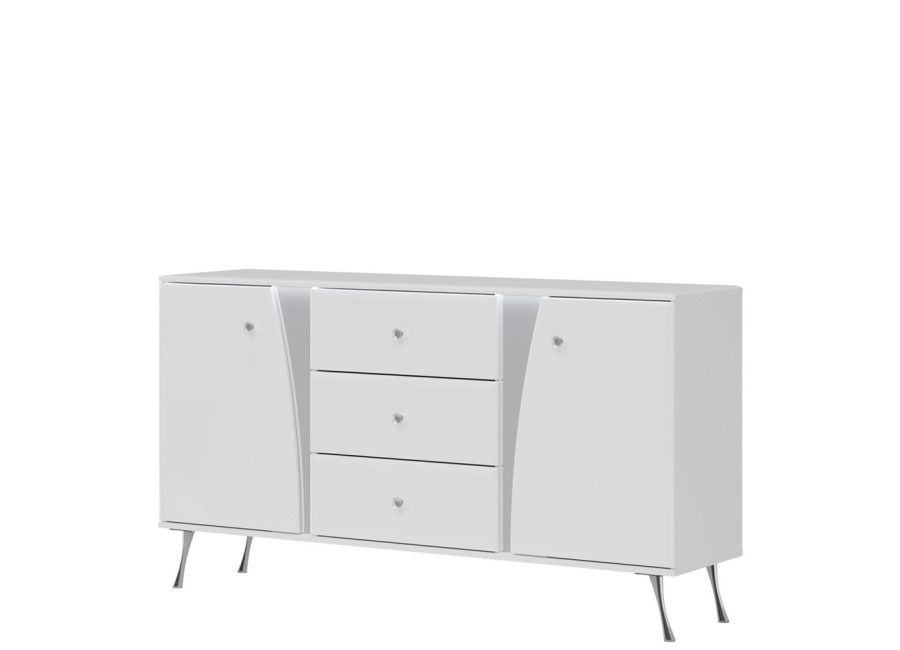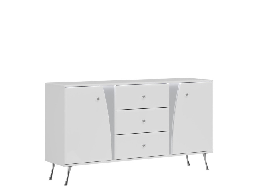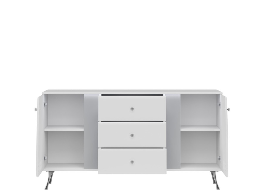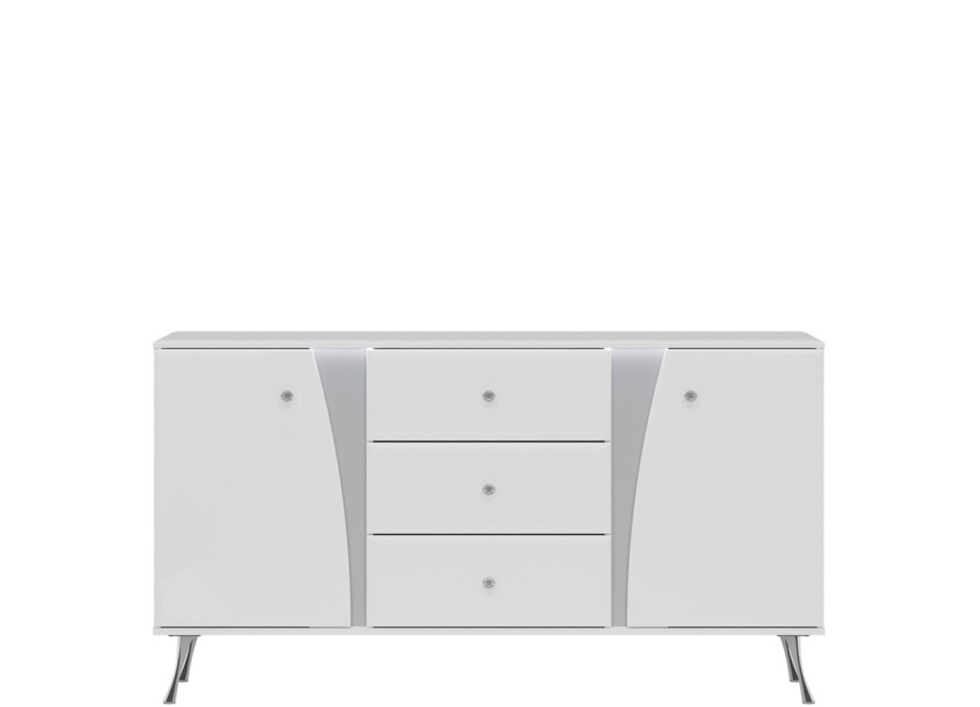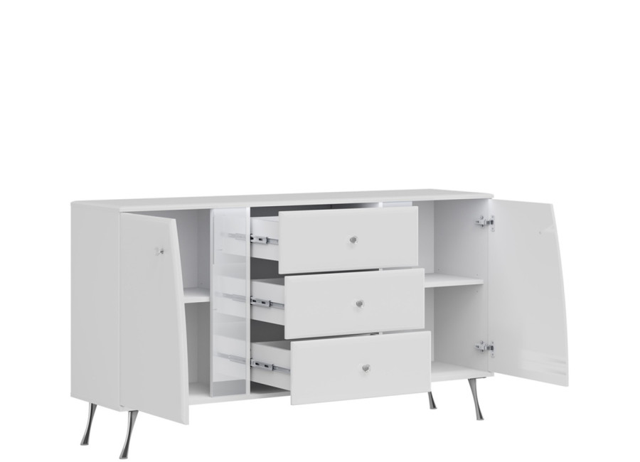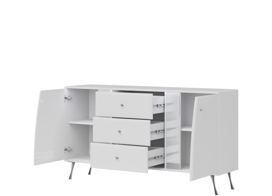 Komoda LUXOR vyniká elegantným dizajnom v bielom vysokom lesku, ktorý v kombinácii s jemne zaoblenými hranami, kryštálovými úchytkami a štíhlymi chrómovanými nohami vnáša do interiéru nádych luxusu a ľahkosti. Úložný systém je prehľadne členený, v strede nájdete tri priestranné zásuvky a na pravej a ľavej strane funkčnú skrinku s dvierkami.