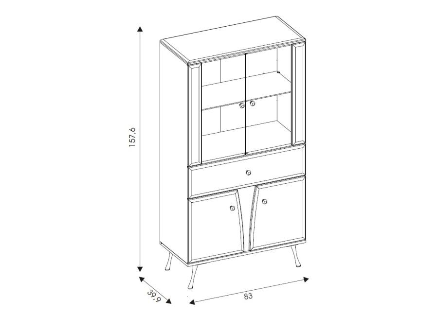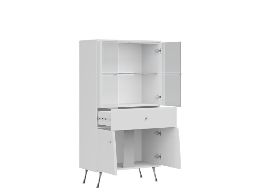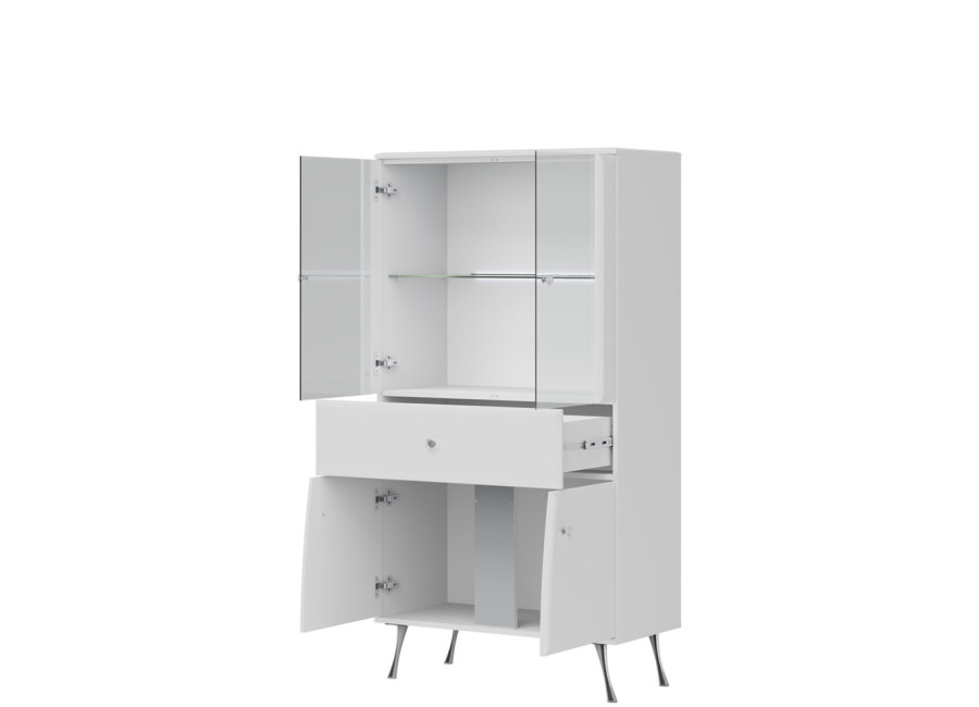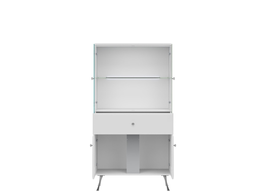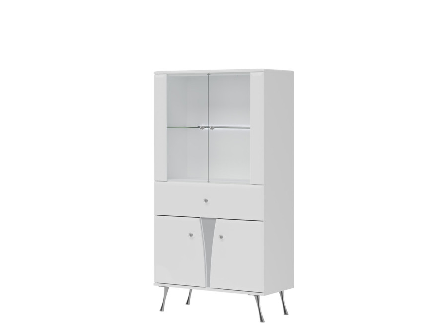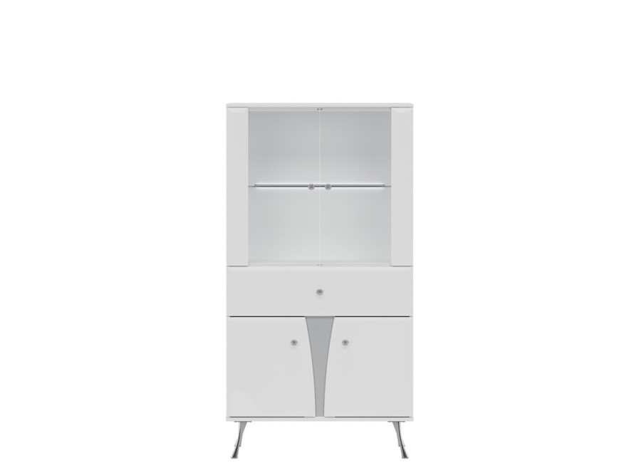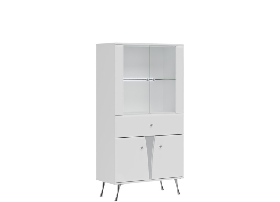 Elegantná vitrína LUXOR vo vysokom lesku predstavuje dokonalé prepojenie elegantného dizajnu s luxusnými detailmi, ako sú kryštálové úchytky a štíhle chrómované nohy, ktoré dodávajú celému kúsku výnimočnú ľahkosť. Prakticky členený úložný priestor zahŕňa hornú presklenú časť ideálnu na vystavenie dekorácií, stredovú zásuvku na drobnosti a spodnú časť s dvierkami.