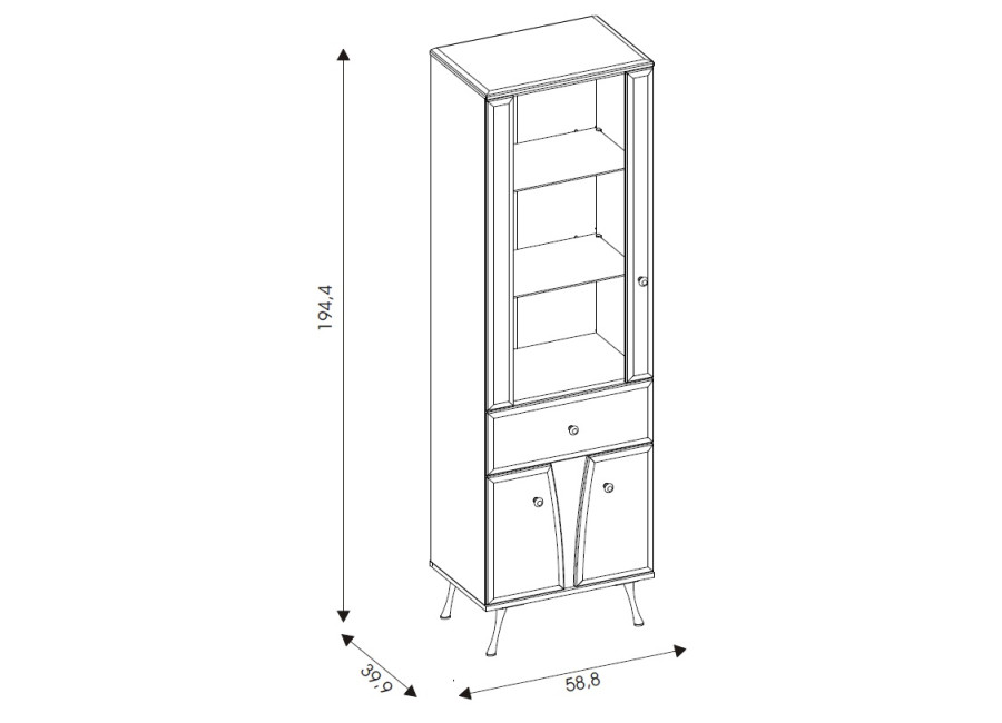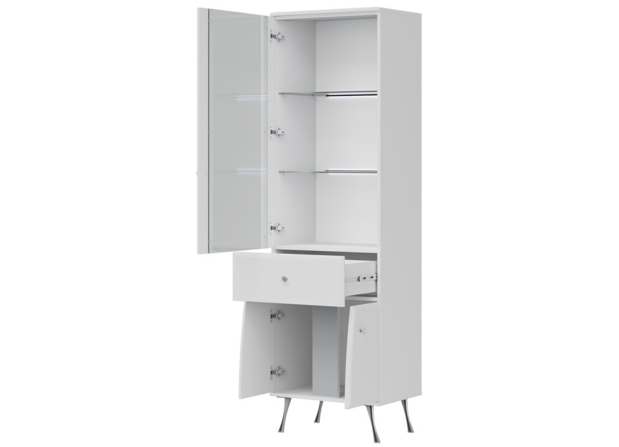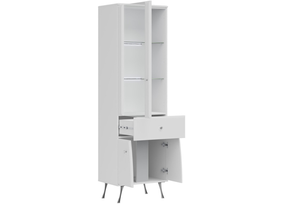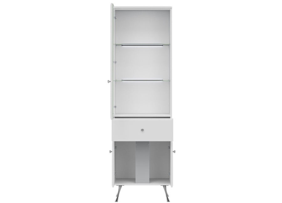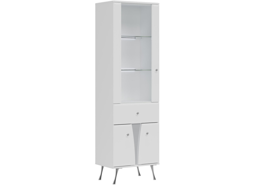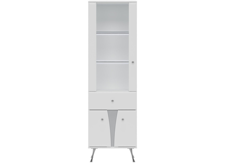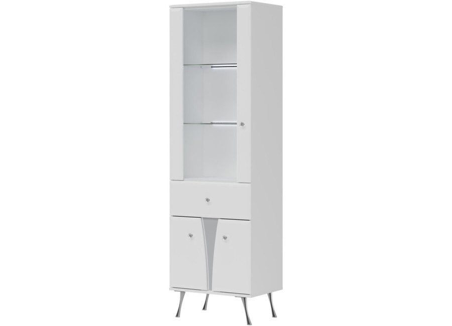 Elegantná vitrína LUXOR vo vysokom lesku predstavuje dokonalé prepojenie elegantného dizajnu s luxusnými detailmi, ako sú kryštálové úchytky a štíhle chrómované nohy, ktoré dodávajú celému kúsku výnimočnú ľahkosť. Prakticky členený úložný priestor zahŕňa hornú presklenú časť ideálnu na vystavenie dekorácií, stredovú zásuvku na drobnosti a spodnú časť s dvierkami.
