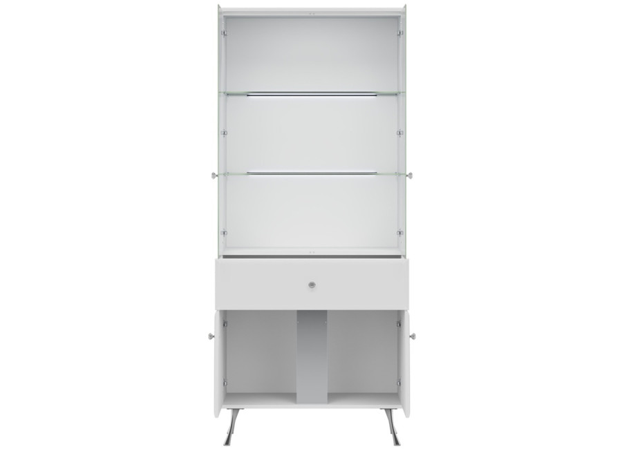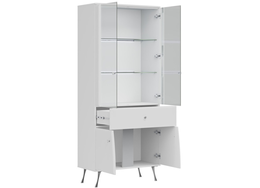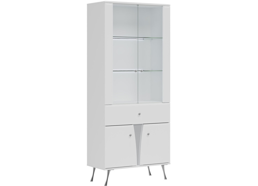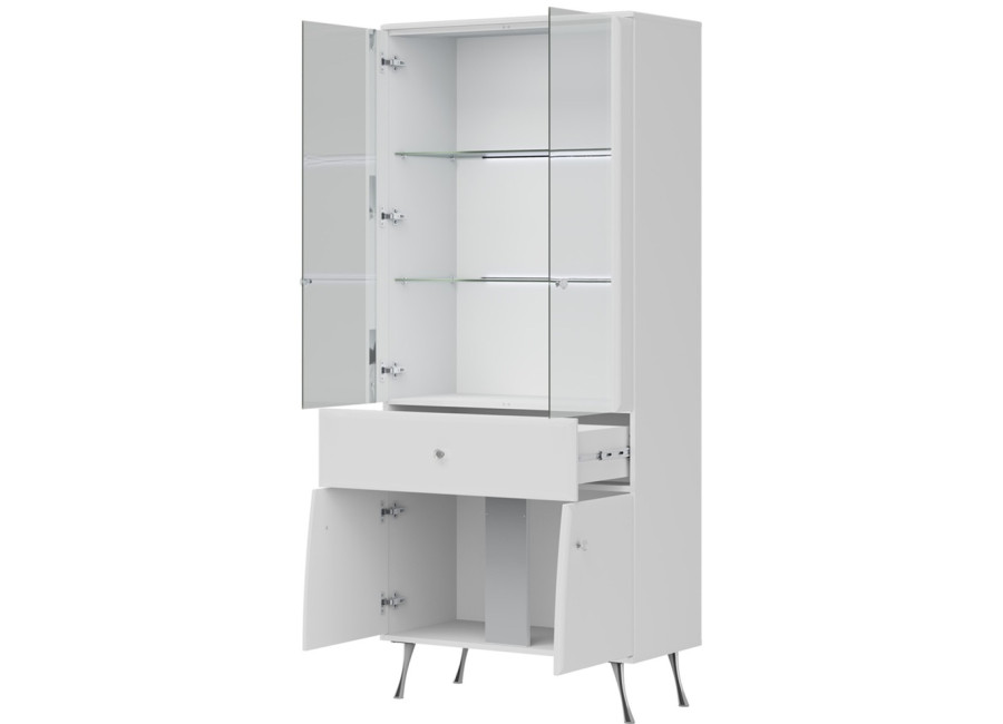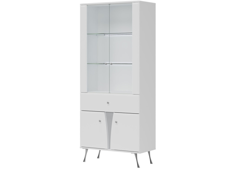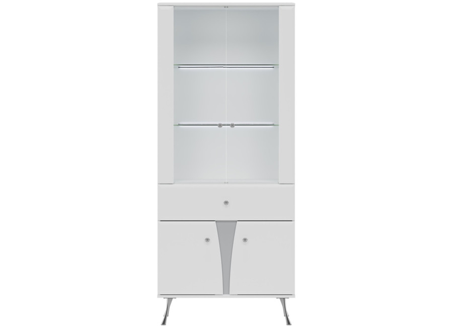 Elegantná vitrína LUXOR vo vysokom lesku predstavuje dokonalé prepojenie elegantného dizajnu s luxusnými detailmi, ako sú kryštálové úchytky a štíhle chrómované nohy, ktoré dodávajú celému kúsku výnimočnú ľahkosť. Prakticky členený úložný priestor zahŕňa hornú presklenú časť ideálnu na vystavenie dekorácií, stredovú zásuvku na drobnosti a spodnú časť s dvierkami.