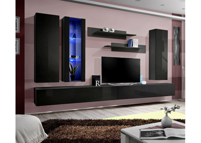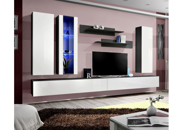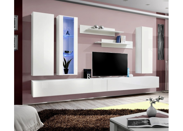 Obývacia stena FLY E4 sa skladá z niekoľkých častí: zo závesných skriniek a vitrín, 2 ks TV stolíkov a 2 ks závesných poličiek. Vhodná je najmä do moderne zariadených priestorov. Dvierka z vysokého lesku sa otvárajú pomocou bezúchytového systému PUSH-CLICK, kedy stačí jemne zatlačiť na dvierka, pre otvorenie a opätovné zatvorenie. Všetky skrinky je potrebné zavesiť na stenu, čo oceníte najmä pri upratovaní.