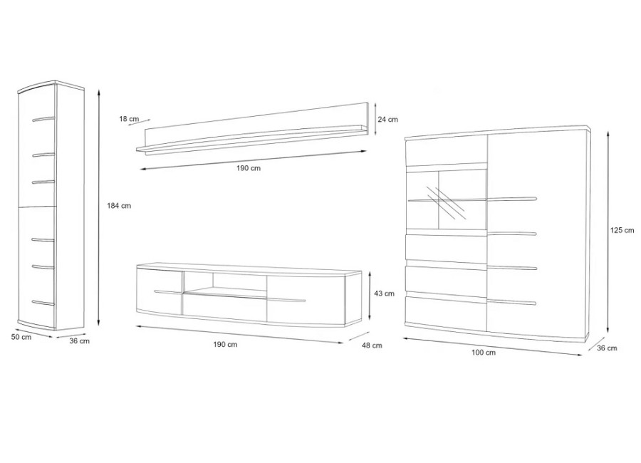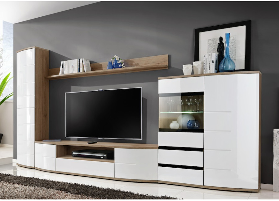 Moderná obývacia stena ONTARIO II má oblé dvierka, ktoré zaujmú každého. Otvárajú sa systémom PUSH-CLICK. Zostava obsahuje policovú skrinku, TV stolík, závesnú policu a komodu.