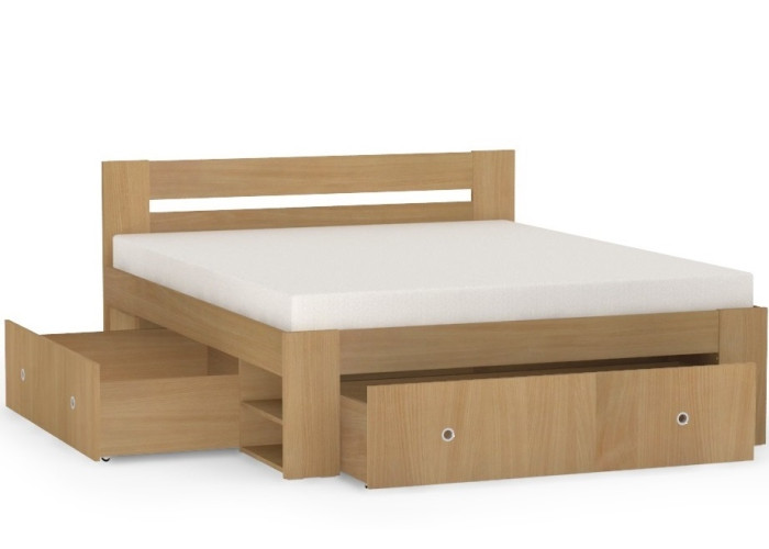 Manželská posteľ zahŕňa: korpus postele + 2ks výsuvných nočných stolíkov + 3 ks výsuvných úložných priestorov + 2 ks odklacích políc.