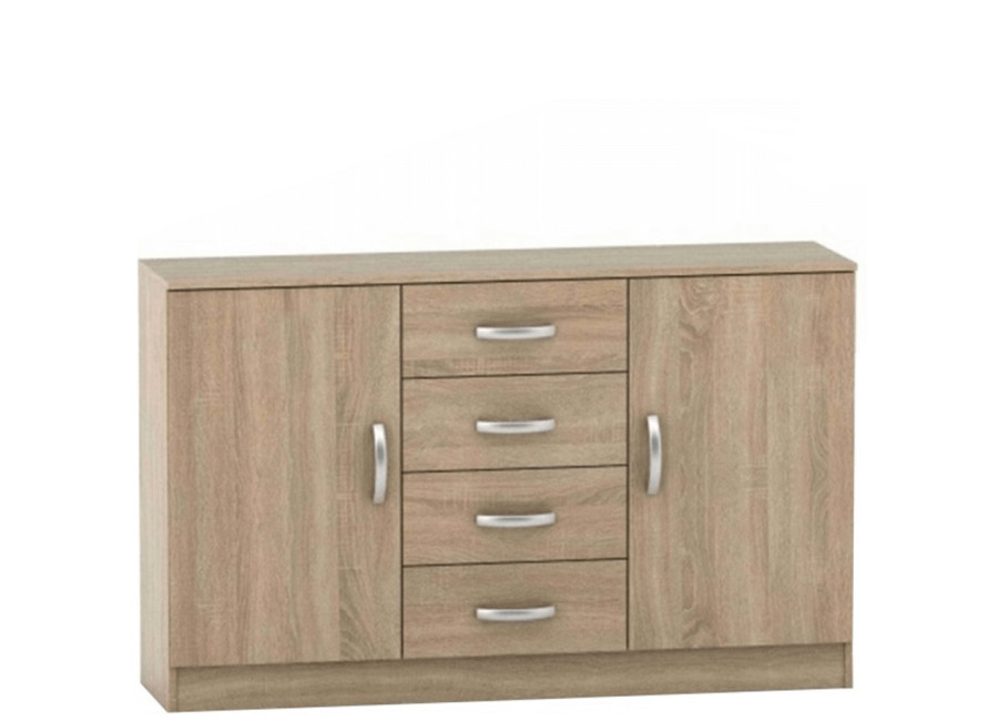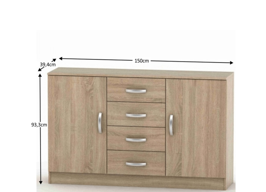 Praktická komoda BETTY BE02-019-00 s dvomi dverami a štyrmi zásuvkami je určená do všetkých priestorov, od spálne až po kanceláriu. Za dverami sú v ľavej i pravej časti skrinky dve police, ktoré rozdeľujú úložný priestor na tri rovnaké časti. Vnútro skrinky a poličky sú v bielom prevedení. Nízka skrinka BETTY je vyrábaná v dezénoch: buk a dub sonoma. Moderný vzhľad skrinky dopĺňajú úchytky BETTY.