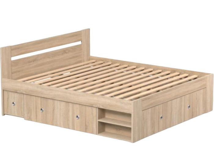 Manželská posteľ zahŕňa: korpus postele + 2ks výsuvných nočných stolíkov + 3 ks výsuvných úložných priestorov + 2 ks odklacích políc.