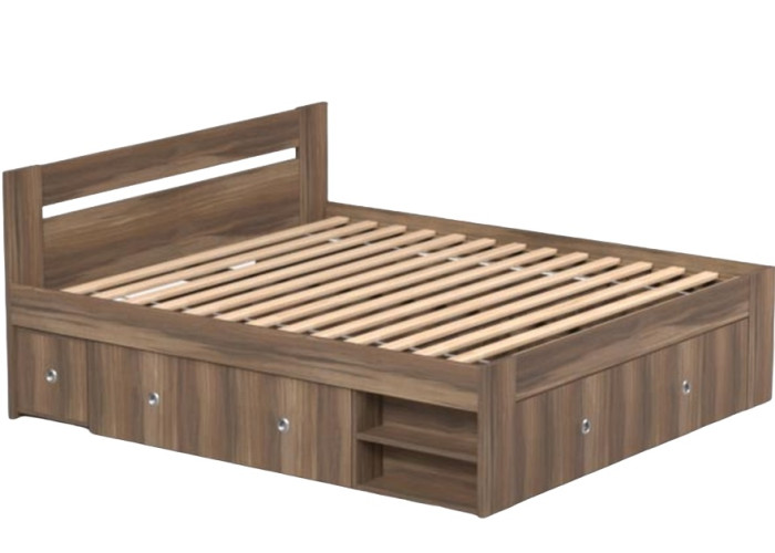 Manželská posteľ zahŕňa: korpus postele + 2ks výsuvných nočných stolíkov + 3 ks výsuvných úložných priestorov + 2 ks odklacích políc.