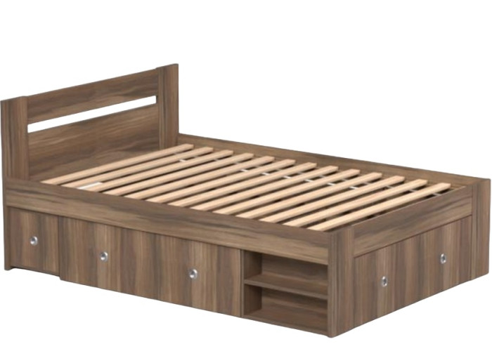 Manželská posteľ zahŕňa: korpus postele + 2ks výsuvných nočných stolíkov + 3 ks výsuvných úložných priestorov + 2 ks odklacích políc.