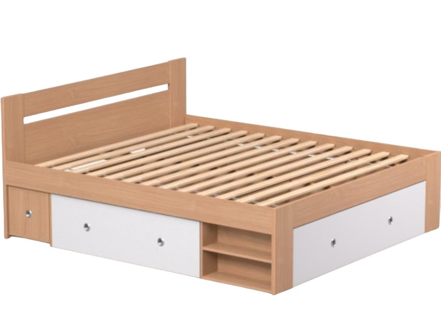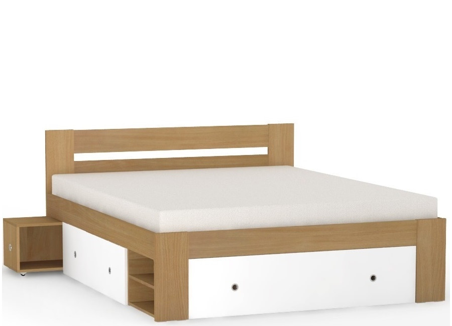 Manželská posteľ zahŕňa: korpus postele + 2ks výsuvných nočných stolíkov + 3 ks výsuvných úložných priestorov + 2 ks odklacích políc.